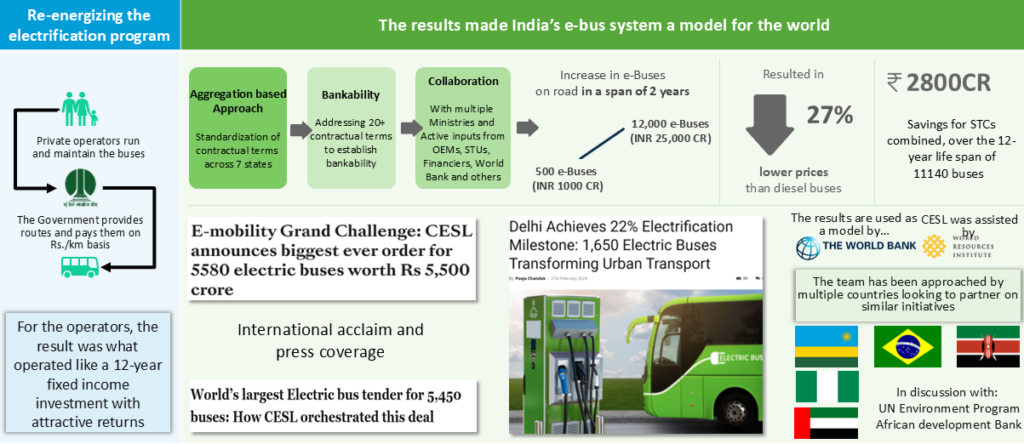 The founding team of INTENT conceptualized and implemented the India e-bus program which resulted in the single largest aggregated public tender of 5450 e-buses. The aggregation of demand across 5 cities and standardized contractual terms resulted in up to 27% cost savings as compared to diesel buses and scaled the market from 1500 e-buses to 12,000 e-buses contracted through two tenders.